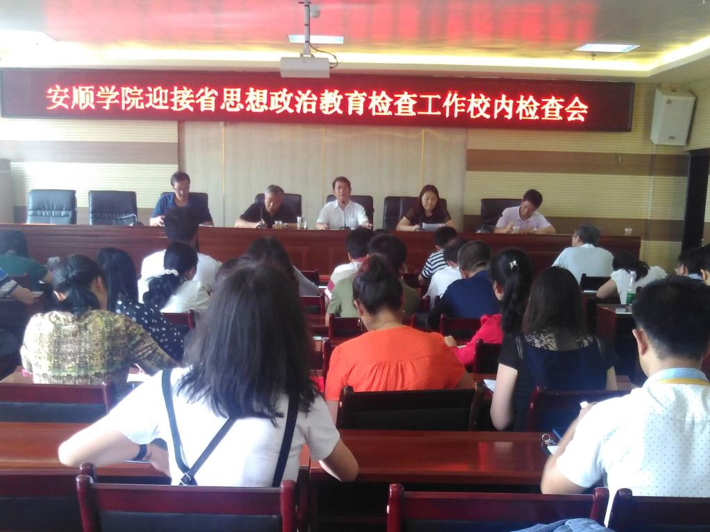 2017年7月14日,安顺学院开展思想政治教育检查工作并召开检查情况反馈会。安顺学院党委副书记陶文彩、副院长令狐荣涛,各责任部门主要负责人、各学院党总支书记(副书记)和迎检工作联络员,领导小组资料组、报告组、现场建设组和专项督导组成员参加校内检查工作。