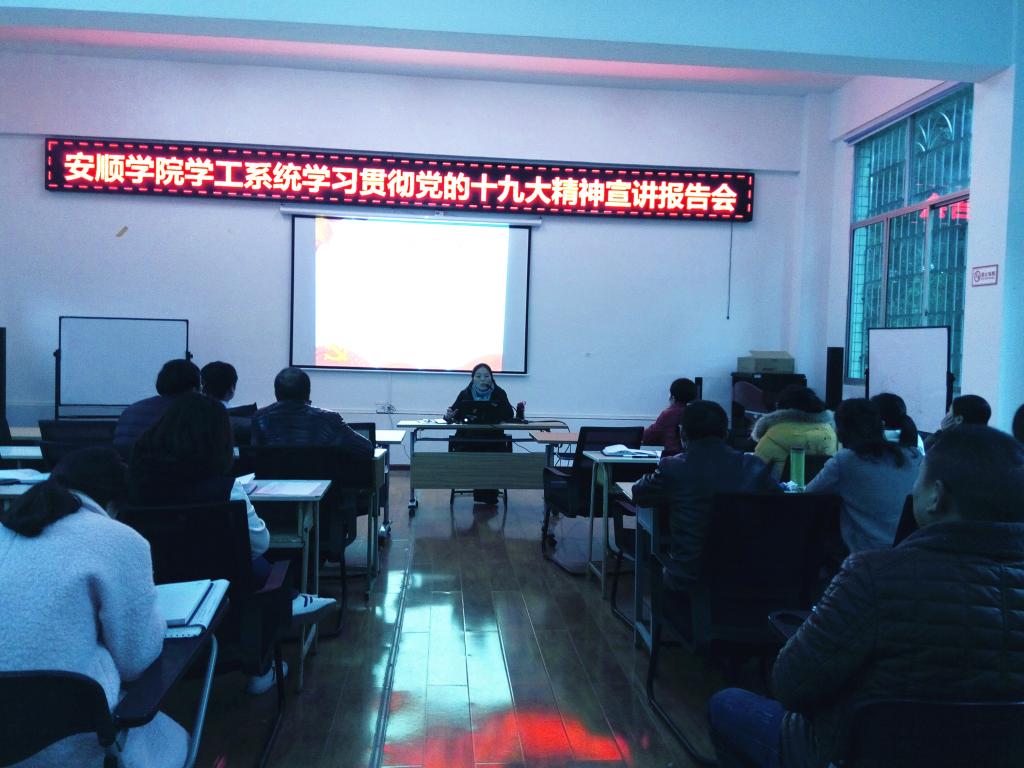 12月11日,安顺学院学工系统学习贯彻党的十九大精神宣讲报告会在就业招聘大厅举行,学习宣传贯彻党的十九大精神和习近平总书记在贵州省代表团重要讲话精神安顺学院高校名师宣讲团成员、学生工作部(处)部(处)长殷红敏教授为全校在岗辅导员,学生处、招就处、学生资助管理中心全体人员作了党的十九大精神和习近平总书记在贵州省代表团重要讲话精神的宣讲。