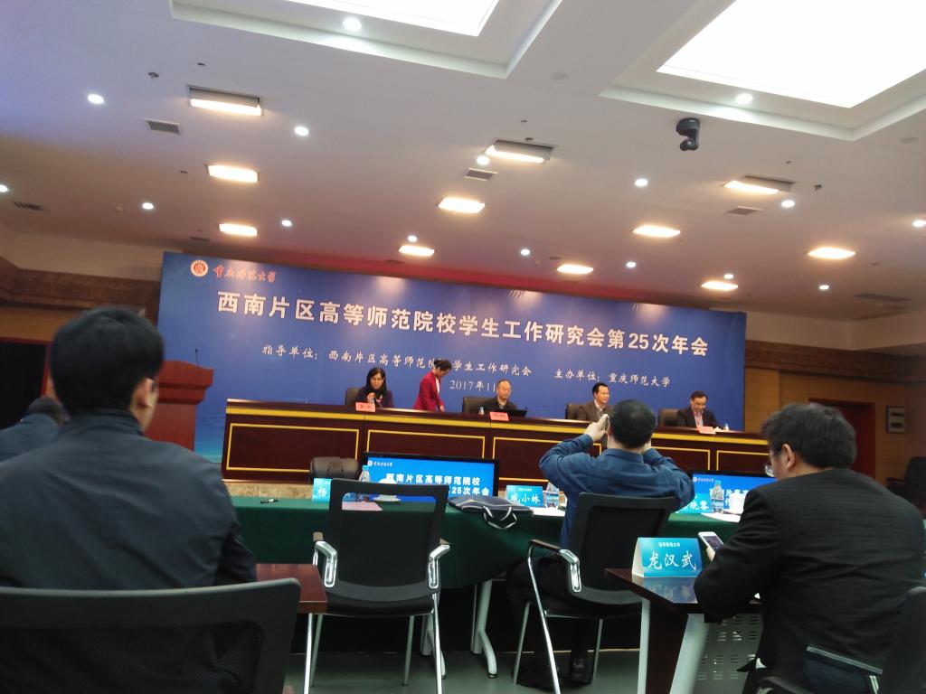 2017年11月9日至11日,西南片区高等师范院校学生工作研究会第25次年会在重庆师范大学举行。我校学工部殷红敏、张明莉两位同志应邀参加了会议,与会人员听取了冯刚(北京师范大学思想政治工作研究院院长)、曾礼(中共重庆市党委党的十九大精神宣讲团专家、重庆师范大学党委书记)、夏晓虹(中国高教学会辅导员工作研究会秘书处办公室主任)三名教育界思政专家的专题报告及六所大学代表的主旨发言。分组讨论时,我校学工部部长殷红敏担任第三组召集人,组织与会人员围绕“高校辅导员队伍专业化职业化实践路径研究”进行了专题讨论。